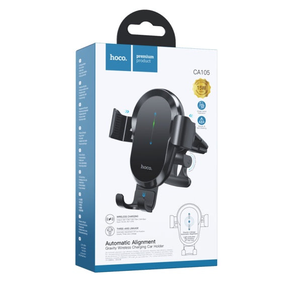 Hoco CA105 - Autohalterung mit kabelloser Aufladung, 15 W, mit seitlichen Clips, Belüftungsmontage, USB-C-Kabel, 1 m, AutoAlign, Schwarz