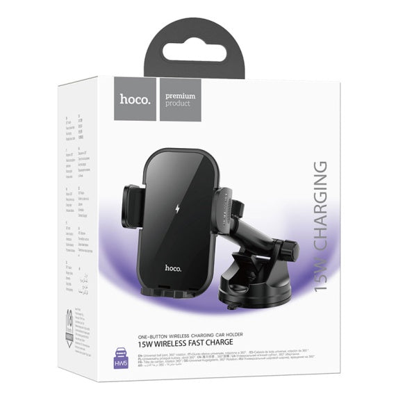 Hoco HW5 - Autohalterung mit 15 W kabellosem Laden mit seitlichen Clips, Armaturenbrettmontage, USB-C-Kabel, 1 m, verstellbarer Arm, Schwarz