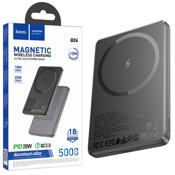 Hoco Q26 - Externer Akku, PowerBank, Kabellos, 22,5 W + PD250 W, Magnetisch, 5000 mAh, Grau