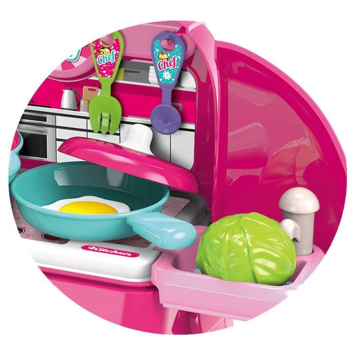 Pregătește-te pentru ore întregi de distracție culinară cu acest set de bucătărie de jucărie, un concept inovator 2-în-1! Transformat cu ușurință într-un ghiozdan roz cu bretele ajustabile, acest set compact și portabil este ideal pentru micii bucătari în devenire. Nu doar că stimulează imaginația și creativitatea, dar le permite copiilor să-și ducă "restaurantul" oriunde merg. Este perfect pentru joaca acasă, la bunici sau la prieteni. [Imaginea cu setul de bucătărie transformat în ghiozdan roz].