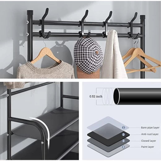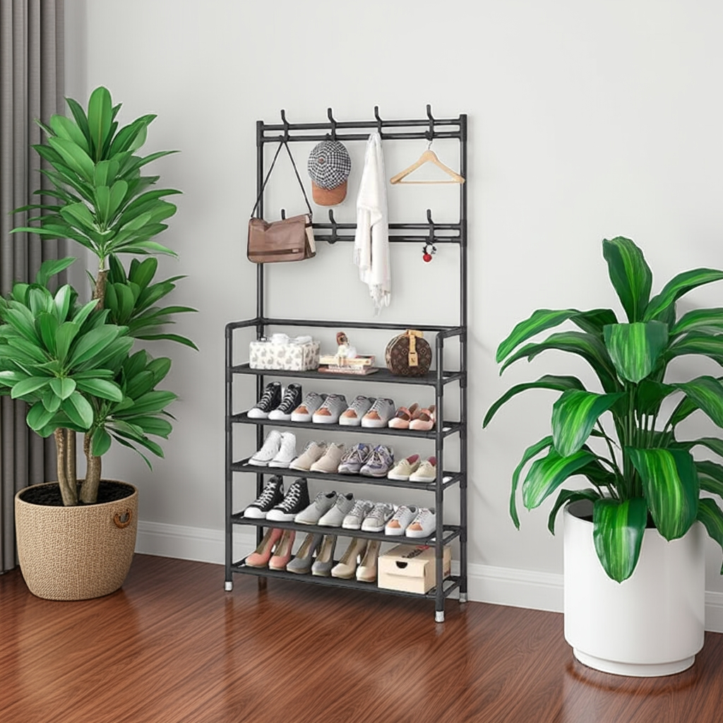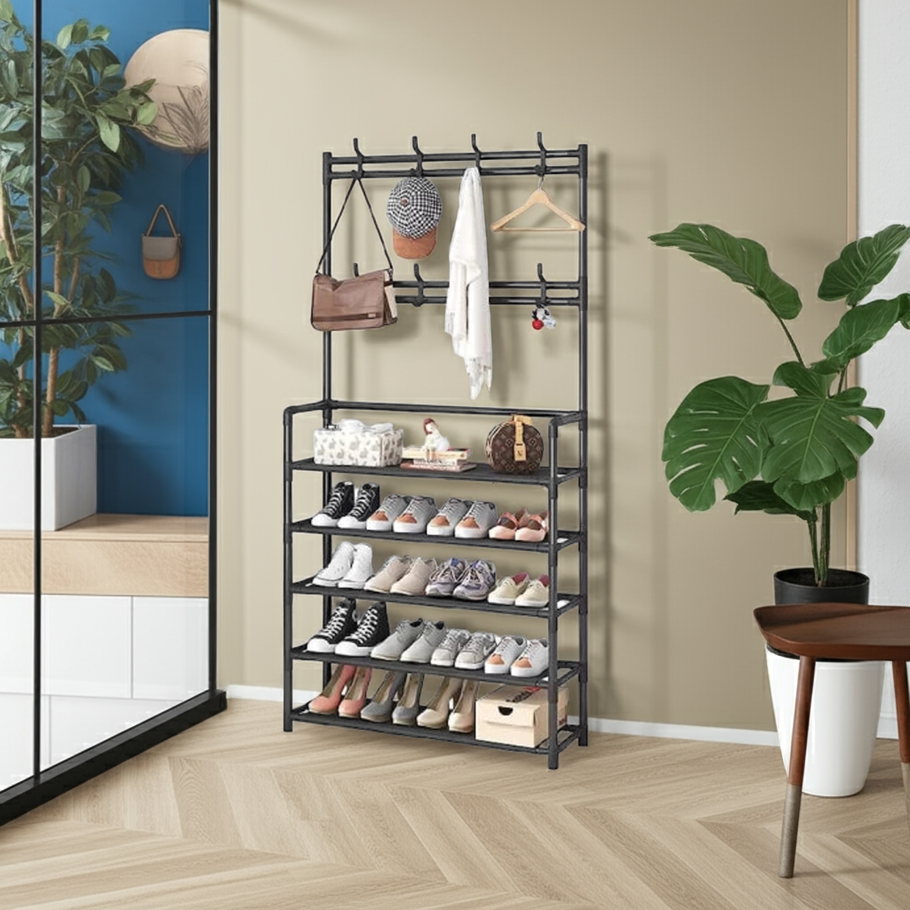 Cuier metalic multifuncțional cu 5 rafturi și 8 cârlige