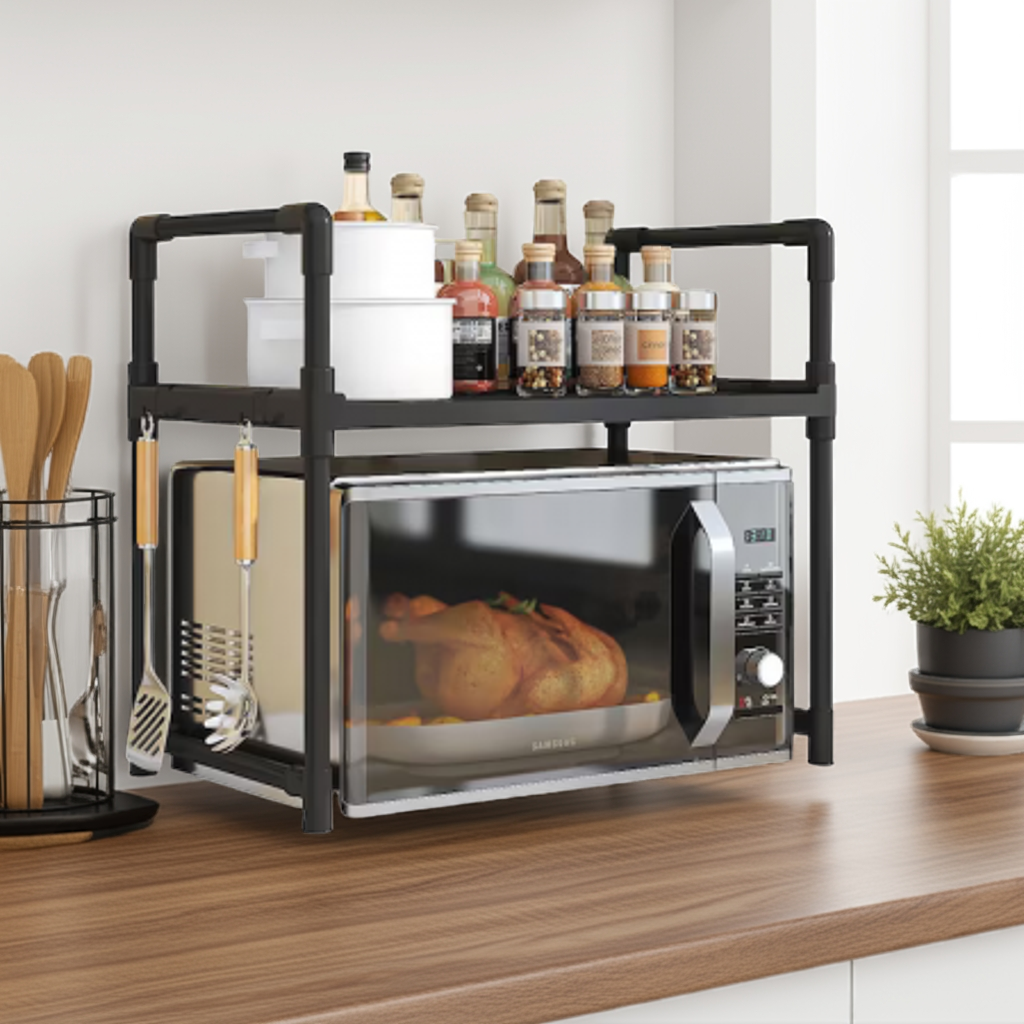 Organizează-ți perfect spațiul în bucătărie! Etajera noastră este soluția ideală pentru depozitarea cuptorului cu microunde și a accesoriilor tale de bucătărie, ajutându-te să economisești spațiu și să păstrezi ordinea în mod elegant și practic.
