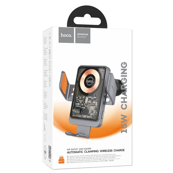 Hoco HW7 - Suport Auto cu incarcare Wireless, 15W, cu cleme laterale, montaj Ventilatie, cablu USB-C, 1m, AutoSensor Lock, Gri-Transparent