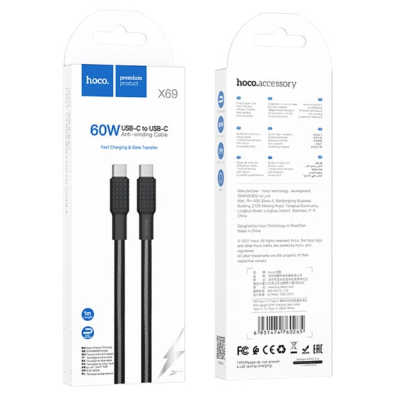 Hoco X69 - Cablu Date si Incarcare, USB-C, PD60W, QC3.0, Flat, Braided, 1m, Negru