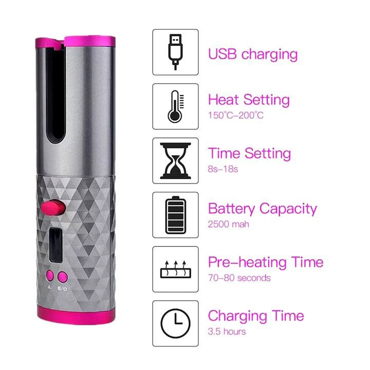 Ondulatorul a fost proiectat cu un material izolant non-toxic în interiorul camerei de ondulare, pentru a te proteja de arsuri. În plus, pe lângă funcția de bază de coafare, bateria litiu-ion de 5000 mAh poate fi utilizată și ca un power bank, permițându-ți să-ți încarci alte gadgeturi. O încărcare completă durează aproximativ 3,5 ore și asigură o autonomie de până la 40 de minute de utilizare continuă. Simplu de utilizat, tamburul se rotește automat pentru a înfășura secțiunea de păr, garantând bucle uniforme de fiecare dată.