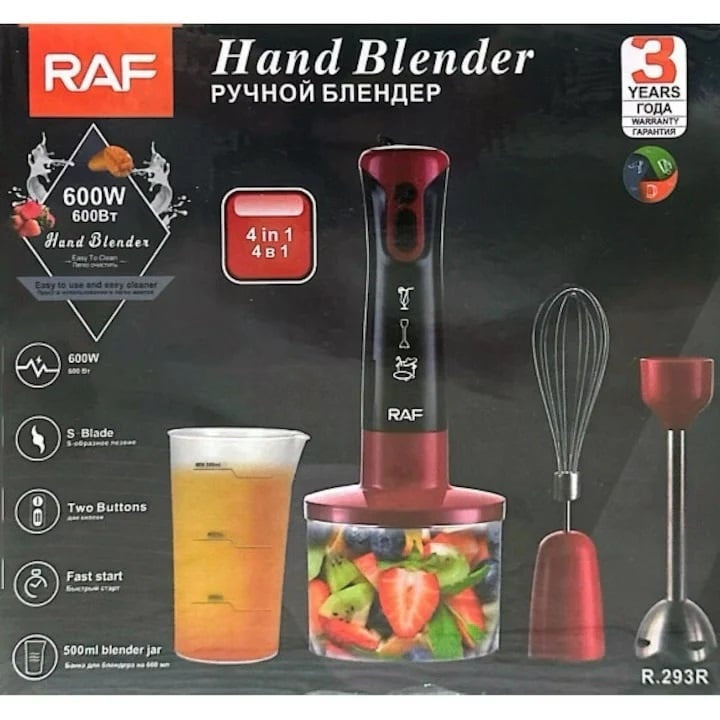Raf R293R - Mixer vertical 4 in 1 600W recipiente 600ml si 500ml rosu-negru