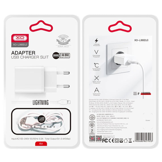 XO L99 - Incarcator retea + cablu LightningQC 3.0 cu 1xUSB-A 2.4A, alb