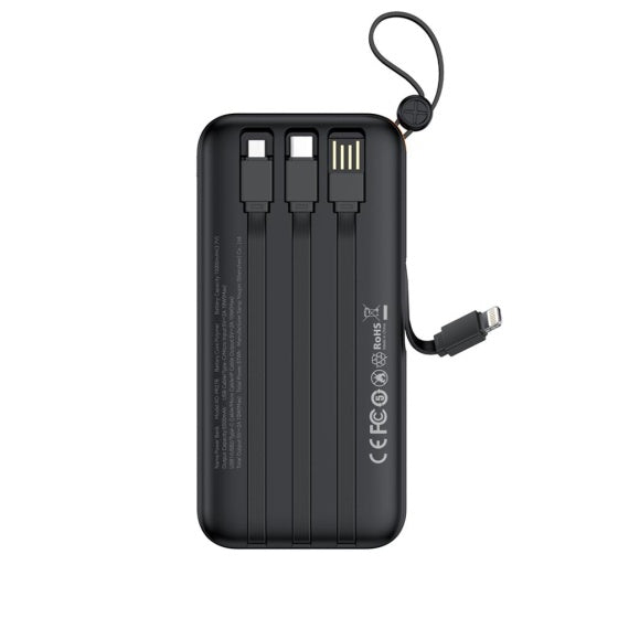 Bateria externă de 10.000mAh este soluția universală și compactă pentru a-ți încărca dispozitivele mobile oriunde te-ai afla. Designul său inovator include cabluri integrate 4-în-1 (USB-A, USB-C, microUSB, Lightning), eliminând nevoia de a transporta cabluri suplimentare. Cu o capacitate generoasă, această baterie externă asigură energie constantă pentru toate gadgeturile tale.